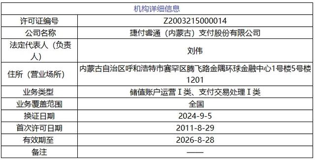 据了解,捷付睿通成立于2011年1月11日,同年8月,捷付睿通获人民银行颁发的《支付业务许可证》,获准开展互联网支付、移动支付、银行卡收单等支付业务。随着支付业务的调整,捷付睿通业务类型变更为“储值账户运营Ⅰ类、支付交易处理Ⅰ类”。