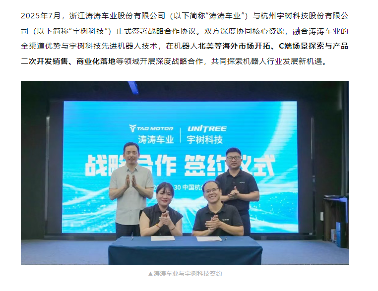 据涛涛车业(301345)官方微信公众号,2025年7月,浙江涛涛车业(301345.SZ)股份有限公司(以下简称“涛涛车业”)与杭州宇树科技股份有限公司(以下简称“宇树科技”)正式签署战略合作协议。双方深度协同核心资源,融合涛涛车业的全渠道优势与宇树科技先进机器人技术,在机器人北美等海外市场开拓、C端场景探索与产品二次开发销售、商业化落地等领域开展深度战略合作,共同探索机器人行业发展新机遇。